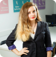 Магістр з комп'ютерних мереж та телекомунікацій. Учасник конференцій з комп'ютерних наук. Закінчила курси з front-end, працює та розвивається у напряму Web-программування.